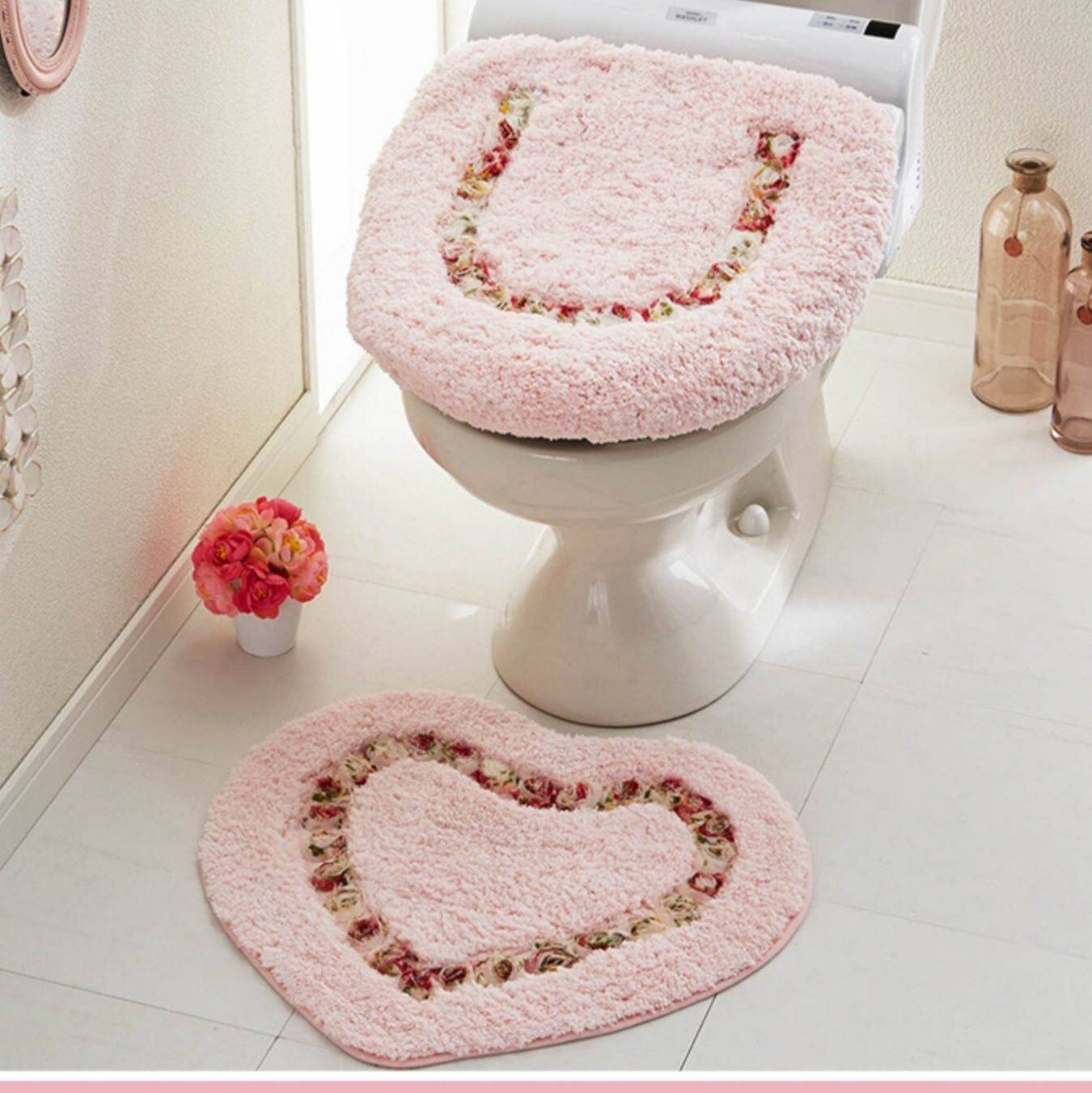 可愛らしいハート型のデザインが特徴的なトイレマットのセットです。