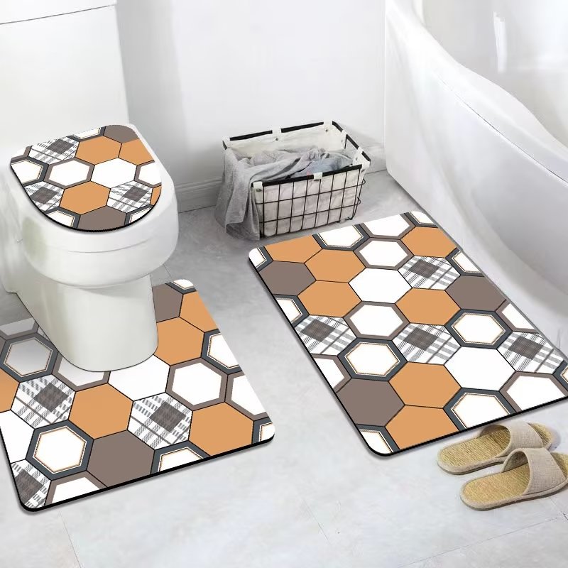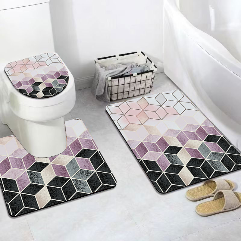 立体感のある幾何学模様が印象的なトイレマットです。 便座カバー、足元マット、便器前マットで、統一されたデザインで空間全体をおしゃれに演出します。 滑り止め加工が施されているため安全性にも配慮されています。 モダンな雰囲気を好む方におすすめの、洗練されたトイレ空間を実現できる商品です。