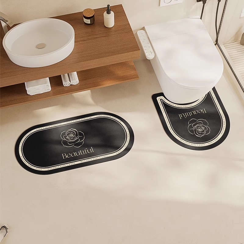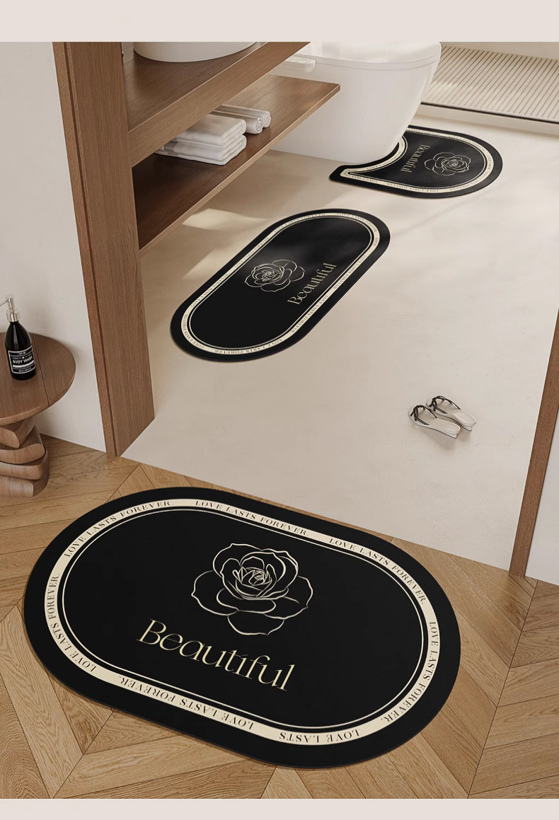 エレガントな薔薇の刺繍が施された高級感溢れるトイレマットです。 便座カバー、足元マット、スリッパマットで、トイレ空間を統一感のある上品な雰囲気に演出します。 縁取りのラインと中央の薔薇モチーフが洗練された印象を与え、日常の空間をワンランク上の特別な場所へと変えてくれます。 滑り止め加工で安全性にも配慮した実用的なデザインです。