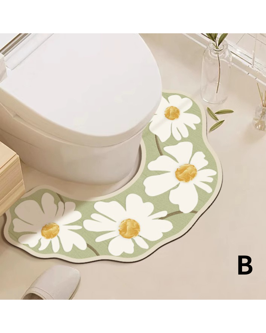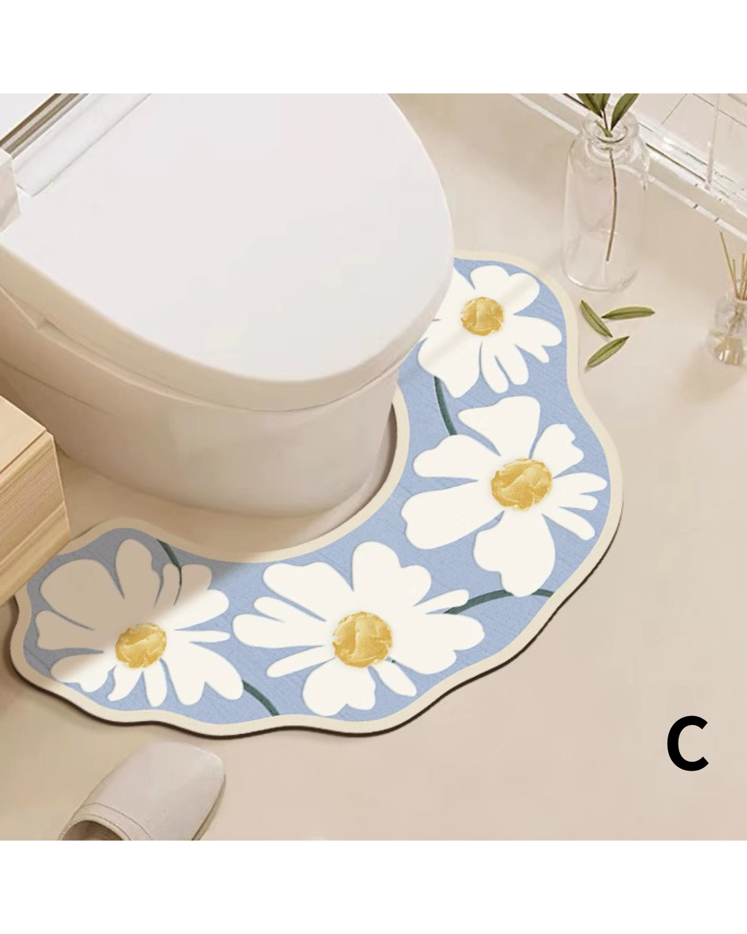 可愛らしいデイジー柄が映える花びら型のトイレマットです。 珪藻土素材を使用しているため、優れた吸水性と速乾性を発揮し、トイレ周りの水滴をすばやく吸収します。 便器周りにぴったりフィットする波型のデザインで、お手入れも簡単です。 天然素材ならではの調湿効果で、いつでもサラサラとした快適な踏み心地を保ちます。 おしゃれで機能的なトイレ空間を演出します。