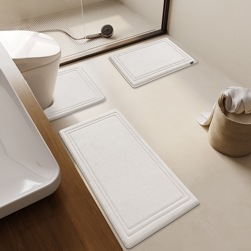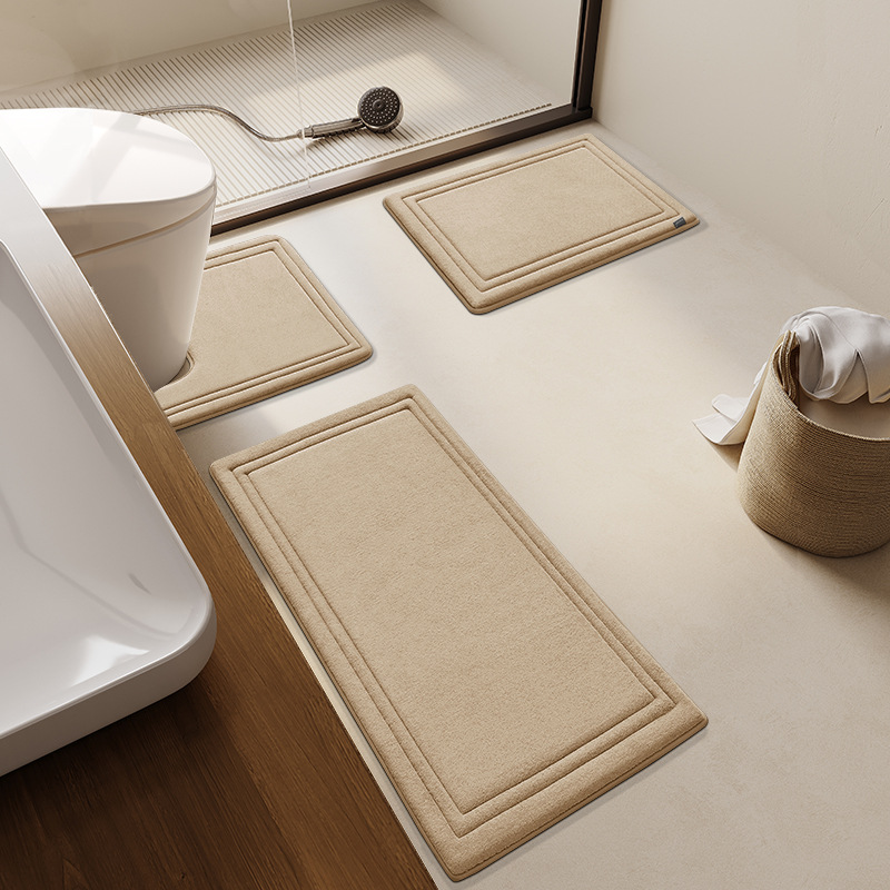 上質な素材と洗練されたデザインが魅力のトイレマットセットです。 二重の縁取りが施されたシンプルで高級感のある仕上がりで、空間に落ち着いた雰囲気をもたらします。 セット内容は便器周り用、足元用、洗面所用の三点で、統一感のある空間演出が可能です。 吸水性と速乾性に優れた素材を使用し、お手入れも簡単で清潔に保てます。 どんな内装にも馴染むデザインで、日常を格上げするトイレマットです。