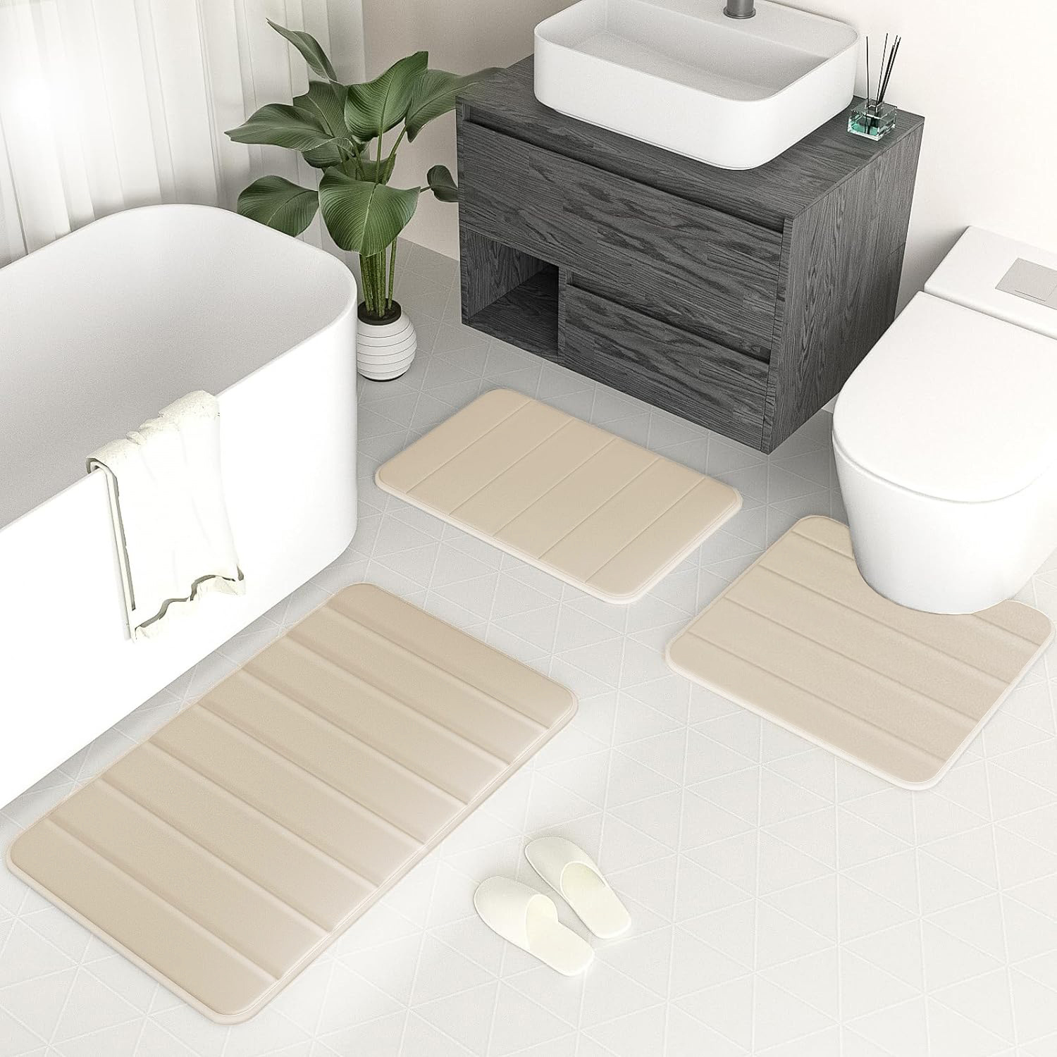便座マット、足元マット、ロングマットの三点セットで、トイレ空間を統一感のある雰囲気に演出します。